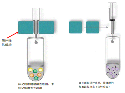 3、在高強度、梯度磁場中標記的細胞被磁性吸附,未標記細胞首先流出,然后洗脫被吸附的細胞(陽性分選)達到細胞磁性分離的目的。