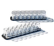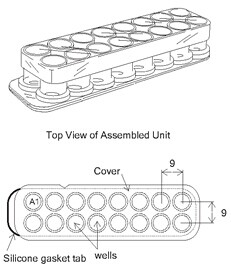 蓋玻片上的腔室共16個(gè),分2排,各8孔(如圖示),每孔的內(nèi)直徑6mm。設(shè)計(jì)的每孔體積和孔距與標(biāo)準(zhǔn)96孔板的相同,無(wú)細(xì)胞毒性的硅膠試劑壩(silicone well gasket)可以與上層聚苯乙烯材料的腔室(the upper structure,厚0.5mm)和基層的硼硅酸鹽蓋玻片(the substructure,厚0.16-.19mm)均形成密封。有上層腔室時(shí)每孔體積250µl,去掉上層腔室后每孔體積9µl。