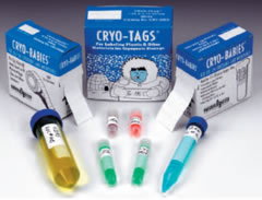 提供Diversified Biotech公司生產的大小不同,顏色各異的低溫標簽。Cryo-Babies®系列標簽是小標簽,對應的Cryo-Tags®是大標簽。標簽均由塑料聚烯烴制造,可以耐受常溫和低溫的貯存環境(液氮的-196°C也沒問題)。該系列標簽可以粘貼于塑料、玻璃、金屬等物體表面,沸水浴100°C中以及干熱溫度達150°C時均不干裂、剝落和降解。此外,標簽抗多種試劑、油、有機試劑、腐蝕性試劑以及其它可以導致剝落的潛在物。室溫下水中浸泡24小時以及100%濕度35°C環境下24小時均沒有問題。