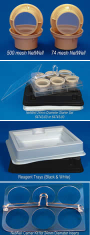 為確保實驗的快速和高效,我們為篩籃配套了提手及籃架(carrier kit)和試劑盤(reagent tray)。篩籃可以直接放進籃架,提到試劑盤進行固定或者染色實驗。試劑盤兩種顏色可供選擇:白色和黑色,白色試劑盤便于觀察顏色變化。黑色試劑盤便于清楚觀察切片位置。方便大家使用,我們提供以下套裝,套裝包含6個直徑24mm的netwell(或者12個直徑15mm的netwell);兩個試劑盤(一黑一白);提籃一套(carrier plate 和handle)。