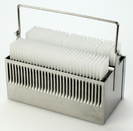 二、玻璃染色缸,配套帶提手的不銹鋼豎式染色架,一個(gè)合適的玻璃蓋子。提供有30片裝染色缸和60片裝染色缸套裝。