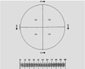 G57是目鏡分劃板的一種,主要應(yīng)用于制藥行業(yè),用于篩選和分析樣本中的顆粒物,檢測顆粒物的分布狀態(tài)。當(dāng)樣本顆粒直徑小于50µm或者顆粒數(shù)量在一定范圍內(nèi)時,G57適合做粒徑大小的分析。G57分劃板上的黑圓點(diǎn)和空心環(huán)分別代表顆粒直為10µm和25µm兩種,可作為與顆粒比對的參考。此外,一個帶刻度的水平比例尺也整合到其中。