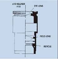 分劃板對潔凈度要求極高,任何微小的灰塵都會在觀測時產(chǎn)生很大的黑點(diǎn),同時分劃板的安裝位置精度要求極高,因此,盡量不要拆卸,如果拆卸,一定要按原樣復(fù)原。選擇分劃板直徑必須與待用目鏡相匹配,并且直徑要略小于目鏡。不同的目鏡其分劃板內(nèi)置位置稍有差別。下圖給出內(nèi)置于開涅爾目鏡示意圖: